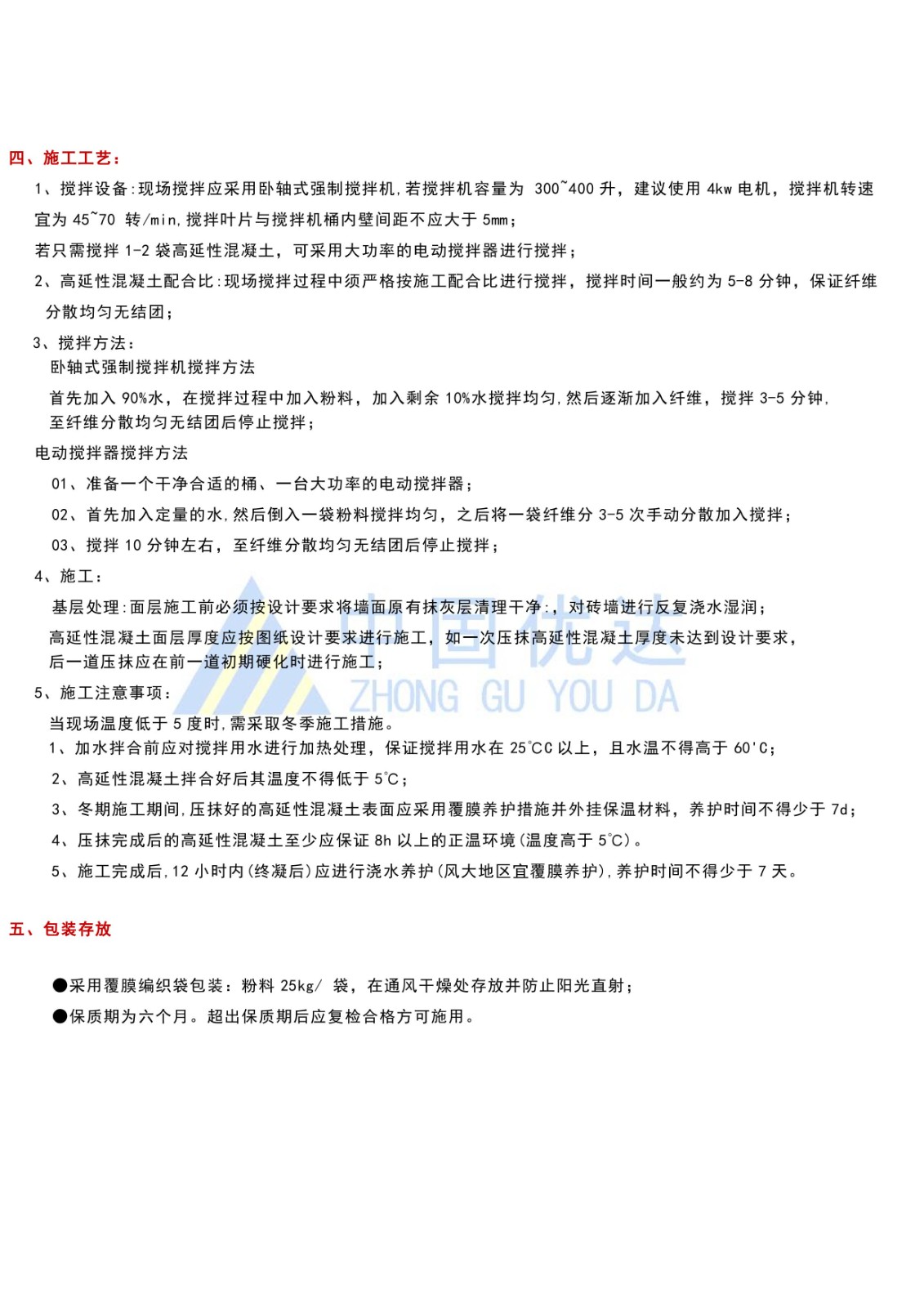 辅助高韧性高弹性纤维和外加剂混合而成,现场加水固化后,具有裂而不断、破而不碎的特性,用于各加固修补的梁板柱以及路面的修补。